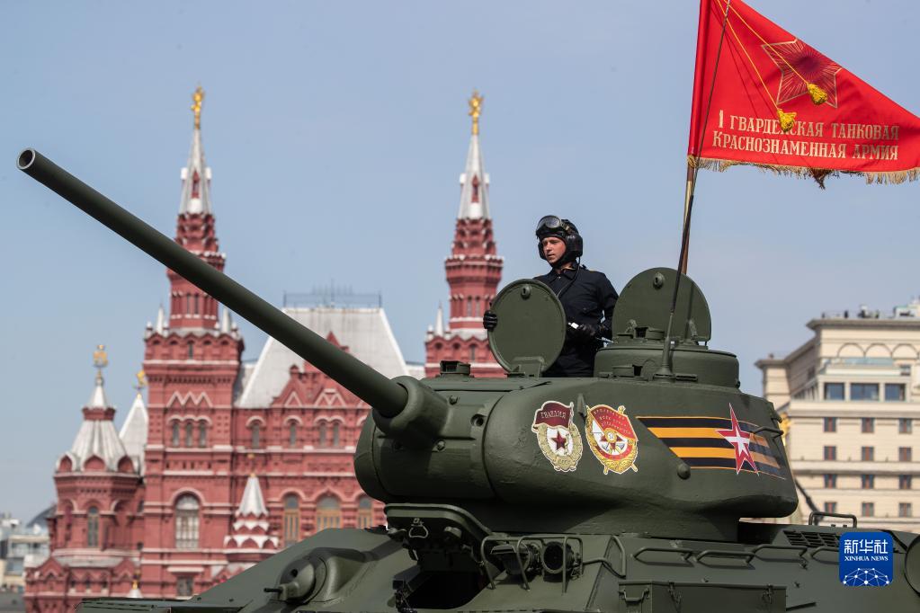 5月7日,在俄罗斯首都莫斯科,一辆T-34坦克驶过红场。新华社记者 白雪骐 摄