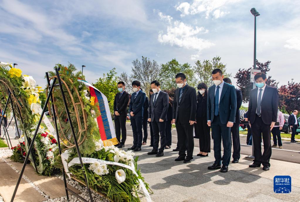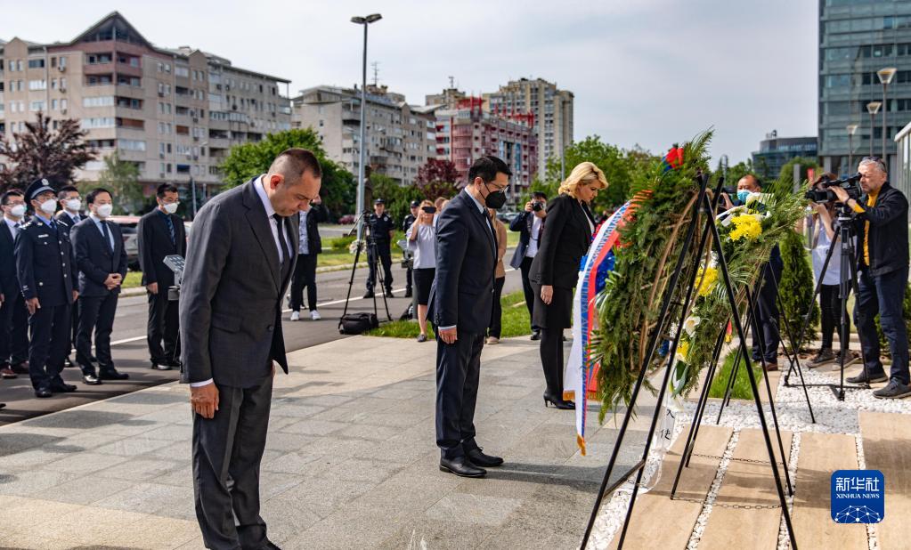 塞尔维亚内务部长武林,劳动、就业、退伍军人与社会事务部长泰帕夫切维奇以及中国驻塞尔维亚大使馆临时代办田一澍,一同向使馆旧址前的纪念碑敬献花圈并默哀。