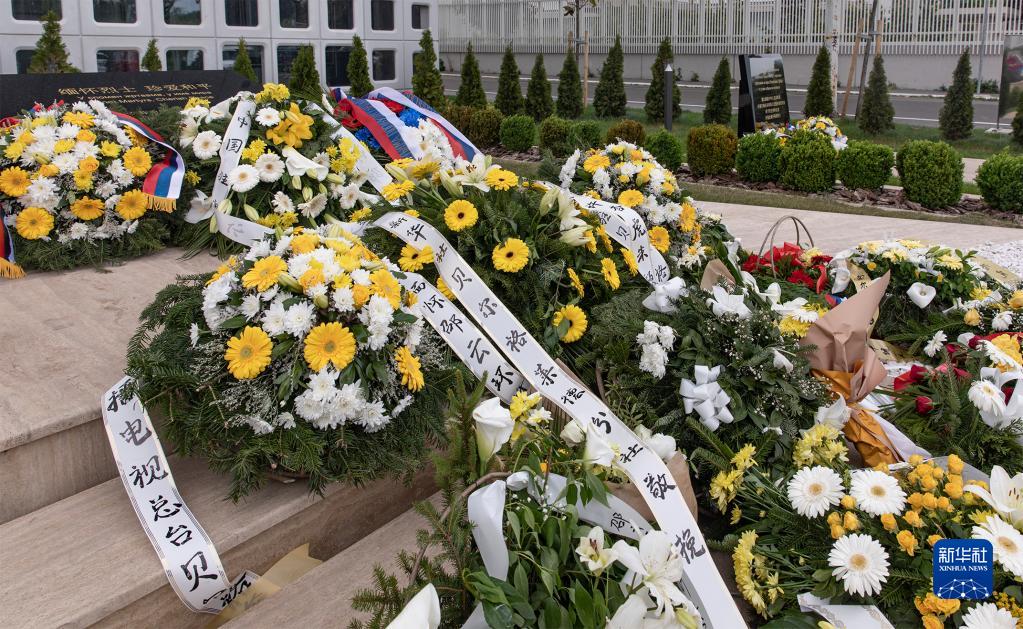 这是5月7日在塞尔维亚贝尔格莱德的中国驻南斯拉夫联盟大使馆旧址纪念碑前拍摄的花圈。新华社发(王韡摄)