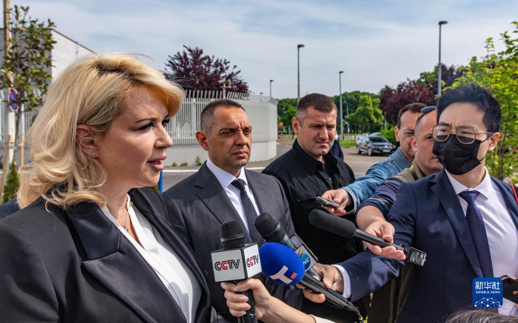 5月7日,塞尔维亚劳动、就业、退伍军人与社会事务部长泰帕夫切维奇(左一)在位于贝尔格莱德的中国驻南斯拉夫联盟大使馆旧址接受记者采访。新华社发(王韡摄)