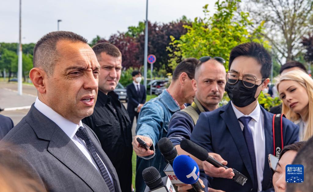 5月7日,塞尔维亚内务部长武林(左一)在位于贝尔格莱德的中国驻南斯拉夫联盟大使馆旧址接受记者采访。新华社发(王韡摄)