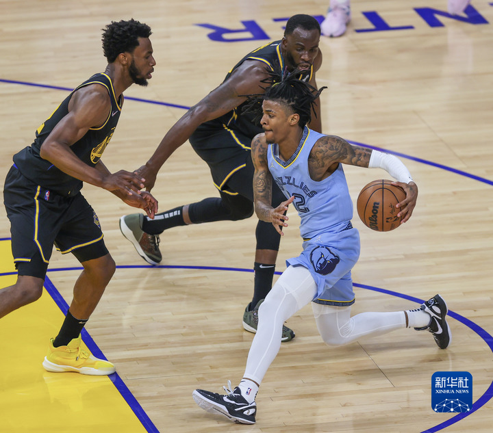 5月7日,灰熊队球员莫兰特(前)在比赛中进攻。新华社发(董旭东摄)