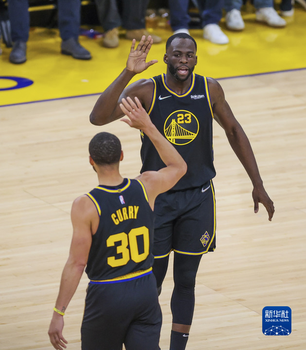 5月7日,勇士队球员斯蒂芬·库里(前)与队友德雷蒙德·格林庆祝。新华社发(董旭东摄)