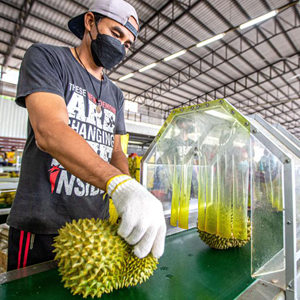 记者看到,上千个榴莲按照大小品级整齐码放在仓库内,不远处堆放着数百个纸箱,上面印着不同的中文品牌和公司名称。工人们麻利地将榴莲分类贴上标签、装箱封好。此外,这些榴莲还要经历一次消毒,随后发往中国市场。