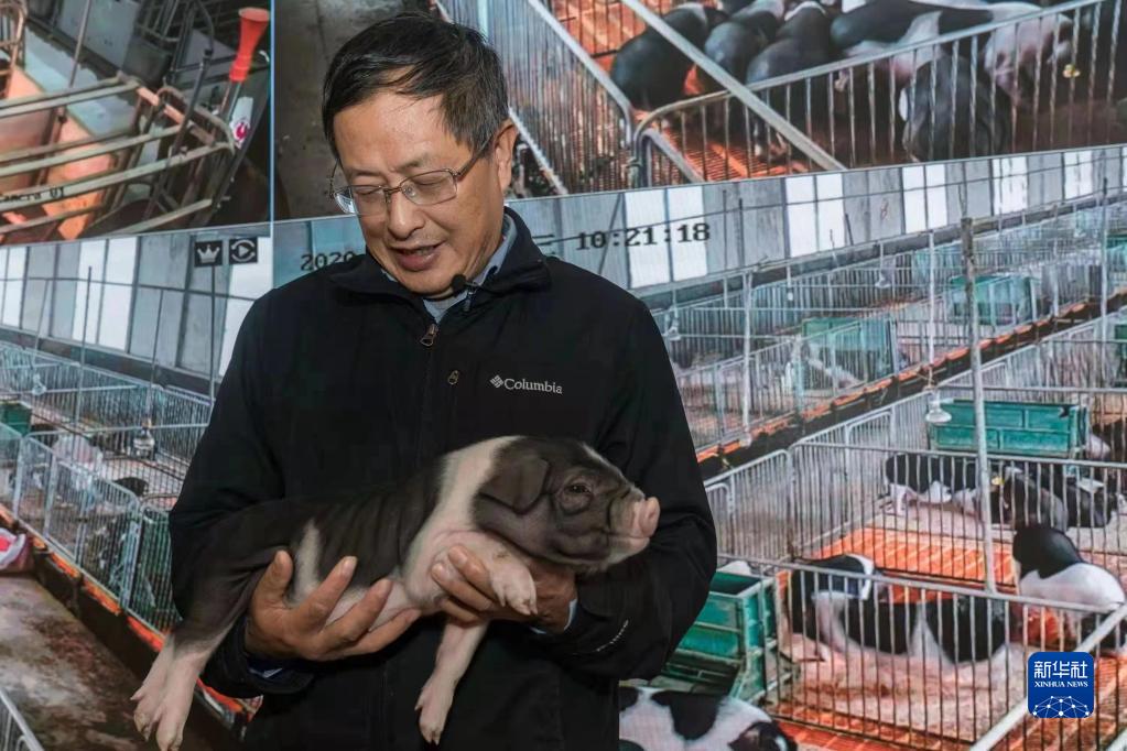 在宁乡国家现代农业产业园,中国工程院院士、中国科学院亚热带农业生态研究所首席研究员印遇龙在查看宁乡花猪(资料照片)。新华社发(受访者供图)