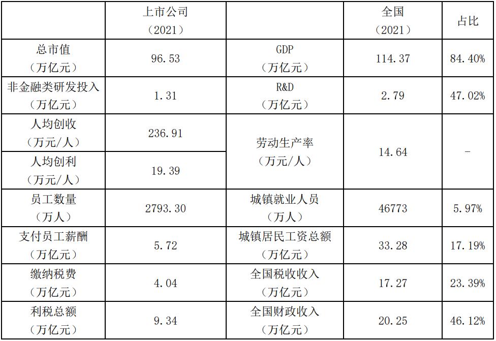 从就业来看,上市公司员工总数为2793.30万人,占全国城镇就业人员的5.97%,2021年支付员工薪酬共5.72万亿元,占全国城镇居民工资总额的17.19%,上市公司人均创收236.91万元,人均创利19.39万元;从利税来看,2021年上市公司共缴纳税收4.04万亿元,2021年全国一般公共预算收入20.25万亿元,其中税收收入17.26万亿元,占全国税收收入的23.41%;上市公司总利税为9.34万亿元,占全国财政收入的46.12%,占全国税收的54.08%。上市公司是国民经济的支柱,经济转型的“领跑者”,是推动经济增长的重要力量。