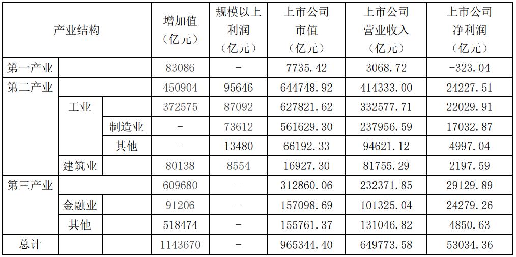 上市公司作为我国4800多万户企业中的优秀代表,是区域经济发展的稀缺资源,数量上只占全国企业数量的万分之一,但却是国家实体经济的“基本盘”。上市公司总市值规模为96.53万亿元,占全国GDP的84.40%,2021年上市公司营收总额为64.97万亿元,同比增长19.81%;净利润总额为5.30万亿元,同比增长19.56%;非金融类上市公司研发投入共计1.31万亿元,占全国企业研发投入的47.02%。