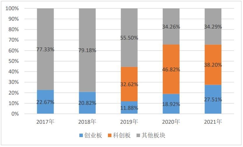 从上市公司的资金流向来看,2021年全年沪深A股募集资金总额5363.48亿元,比上年募资金额增加748.66亿元。其中主板募资1839.21亿元,创业板募资1475.24亿元,科创板募资2049.04亿元,科创板、创业板募资占比为65.71%,随着我国在战略性新兴产业的不断发力,资本流入创新创业企业的比例在逐年上升,资本市场在促进上市公司制造业向高技术、创新型制造业转型升级,例如传统电子行业向新一代信息技术转型、传统医药向生物产业转型等,2021年IPO募集资金金额前五的行业是医药生物(878.89亿元)、电子(591.99亿元)、机械设备(519.74亿元)、通信(497.34亿元)和电力设备(464.20亿元),这五大行业IPO共募集资金2952.16亿元,占2021年IPO募资总额的55.04%,五大行业市值规模共计30.33万亿元,占全市场规模的30.61%。上市公司的整体产业结构正在向科技引导型方向加快迈进。