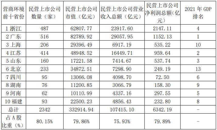 按照2021年全国工商联发布的“万家民营企业评营商环境”,营商环境得分前十的省份依次是浙江、广东、上海、江苏、山东、北京、四川、湖南、河南、福建;营商环境得分前十的城市(不含直辖市)依次是杭州、温州、苏州、深圳、宁波、青岛、南京、广州、长沙、成都。