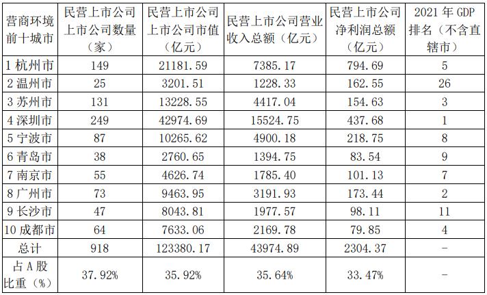 表 5 营商环境前十城市(不含直辖市)民营上市公司经济指标