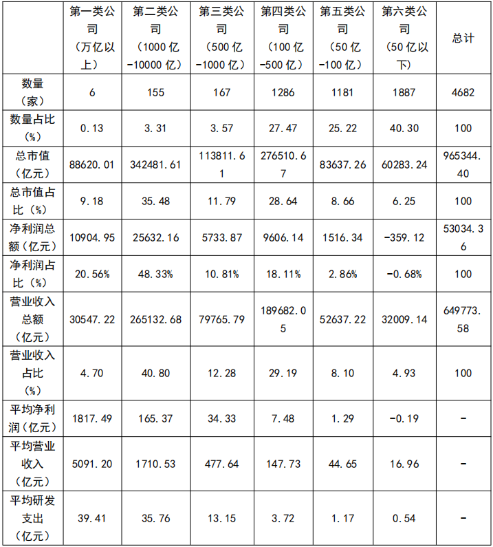 根据A股上市公司的市值,我们将上市公司划分为六类,分别为:第一类公司(万亿市值以上)、第二类公司(千亿市值公司)、第三类公司(500亿--1000亿)、第四类公司(100亿--500亿)、第五类公司(50亿--100亿)和第六类公司(50亿以下)。六大类型公司呈现出六大经济特征: