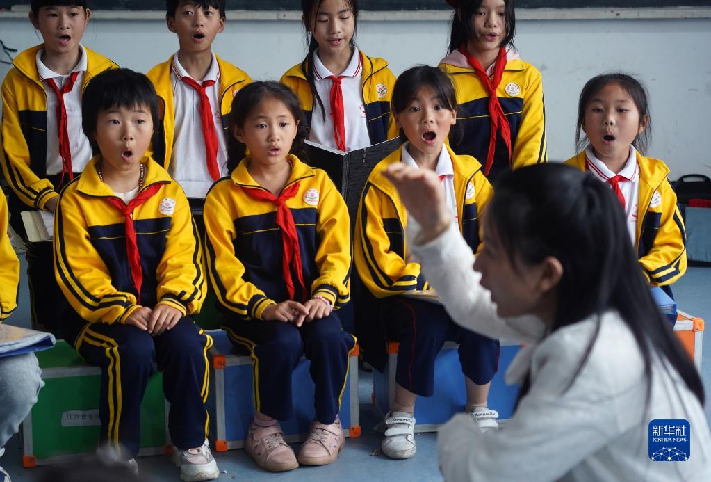 在分宜县洞村中心学校,合唱团的孩子们在老师钟琳珊(前排)的带领下排练歌曲(5月24日摄)。