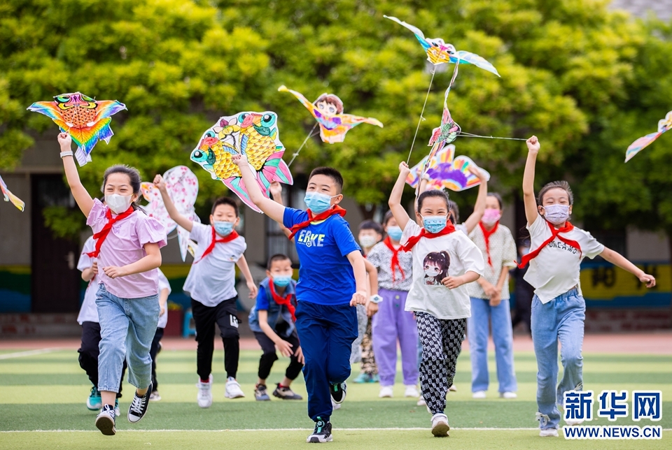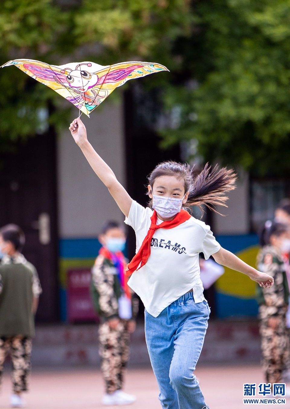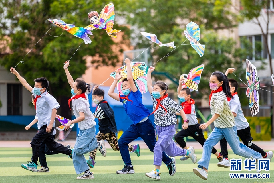 5月31日,呼和浩特市玉泉区五塔寺东街小学学生在校园操场上放飞风筝。新华网发(丁根厚 摄)