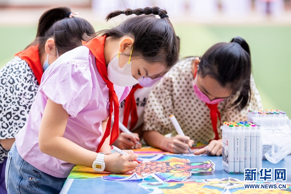 5月31日,呼和浩特市玉泉区五塔寺东街小学学生在彩绘风筝。新华网发(丁根厚 摄)
