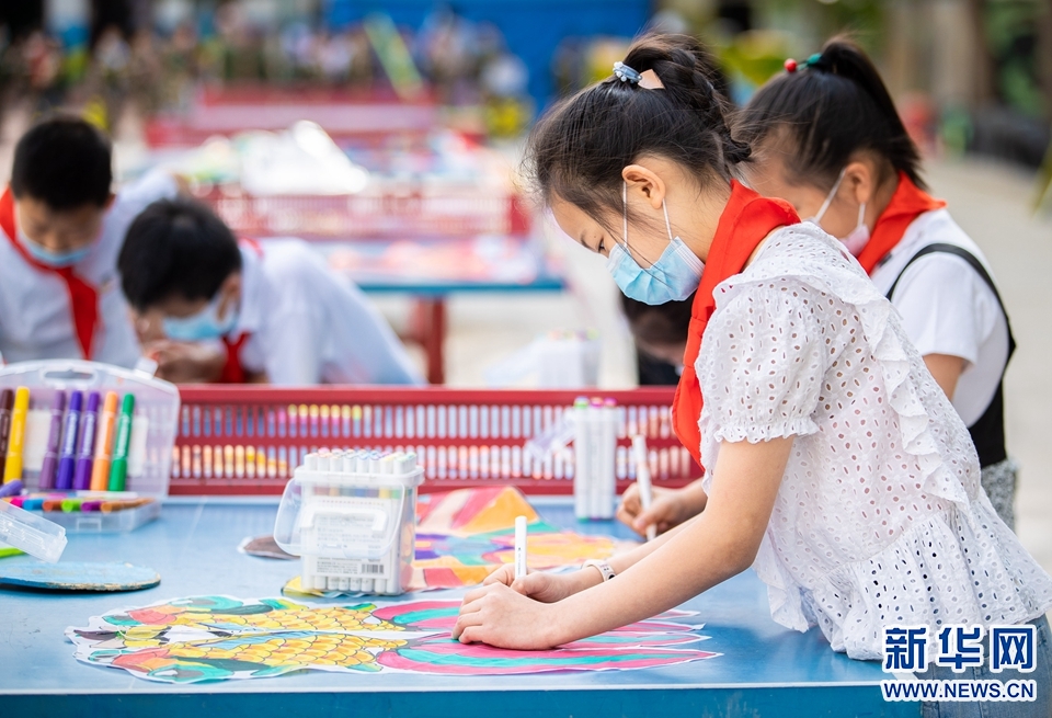 5月31日,内蒙古呼和浩特市玉泉区五塔寺东街小学学生在彩绘风筝。新华网发(丁根厚 摄)