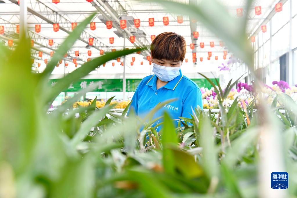 5月18日,在临沂市兰陵县代村国家级现代农业示范园,工作人员在打理蝴蝶兰。新华社记者郭绪雷摄