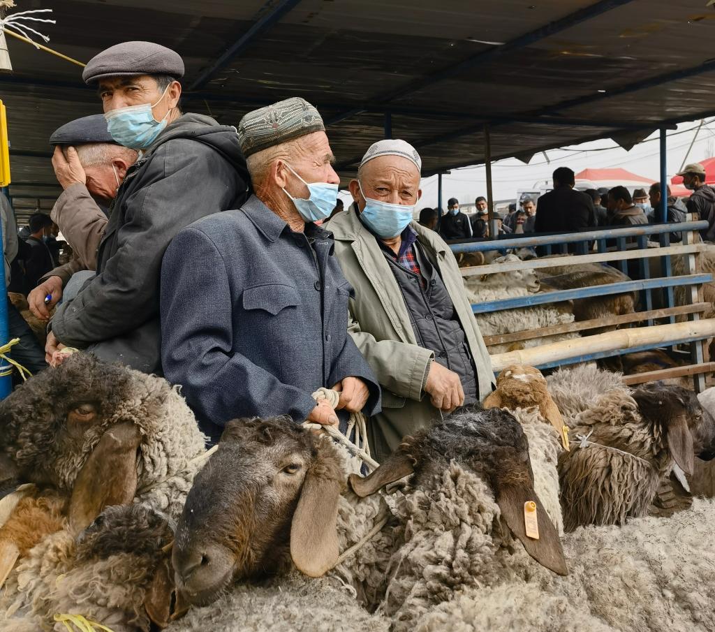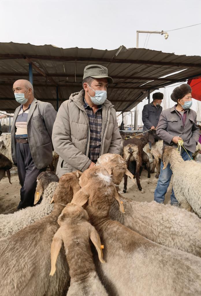 “牛羊巴扎”上的牧民正在等待买家(3月22日摄)。新华社记者 何军 摄