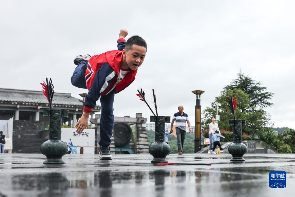 6月3日,在贵州省贵阳孔学堂举行的端午活动上,一名小朋友在体验投壶游戏。