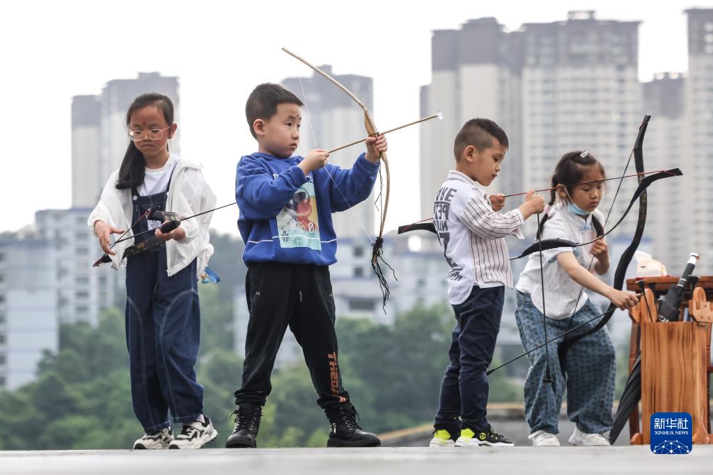 6月3日,在贵州省贵阳孔学堂举行的端午活动上,几名小朋友在体验“射五毒”。