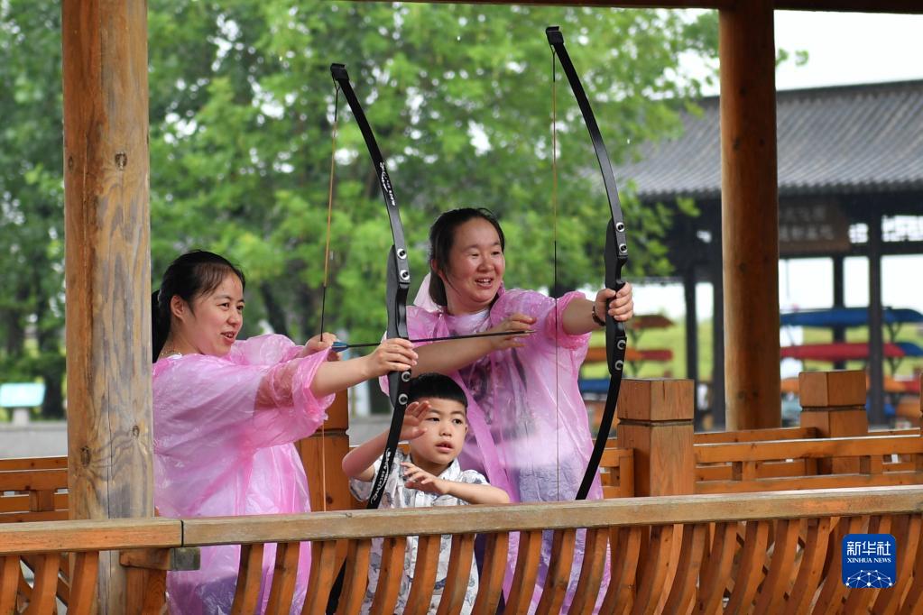 6月3日,在湖南省汨罗市屈子文化园,游客在体验射箭。