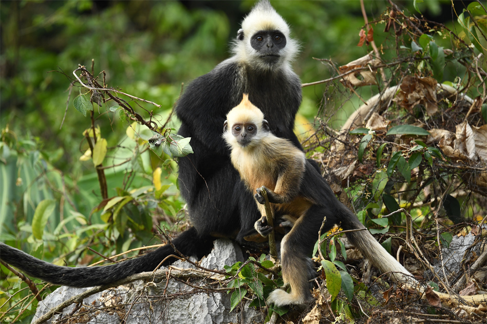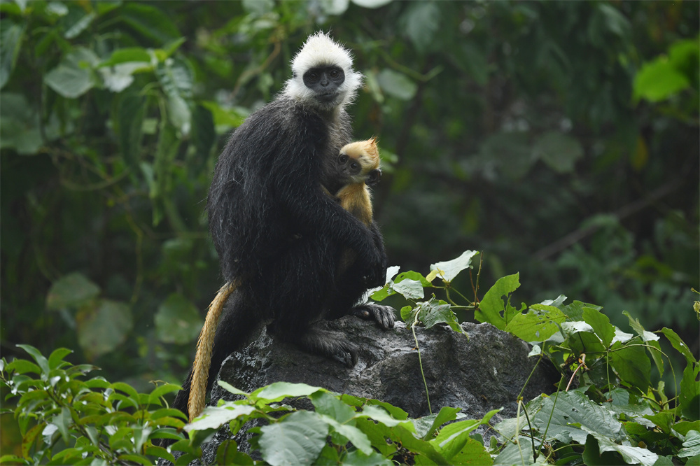 “白头叶猴”,顾名思义,头顶一撮白毛,是我国特有的国家一级重点保护野生动物,种群数量稀少,主要分布在崇左市左江和明江之间不足200平方公里的喀斯特石山地区,它还有个好听的名字叫“石山精灵”。