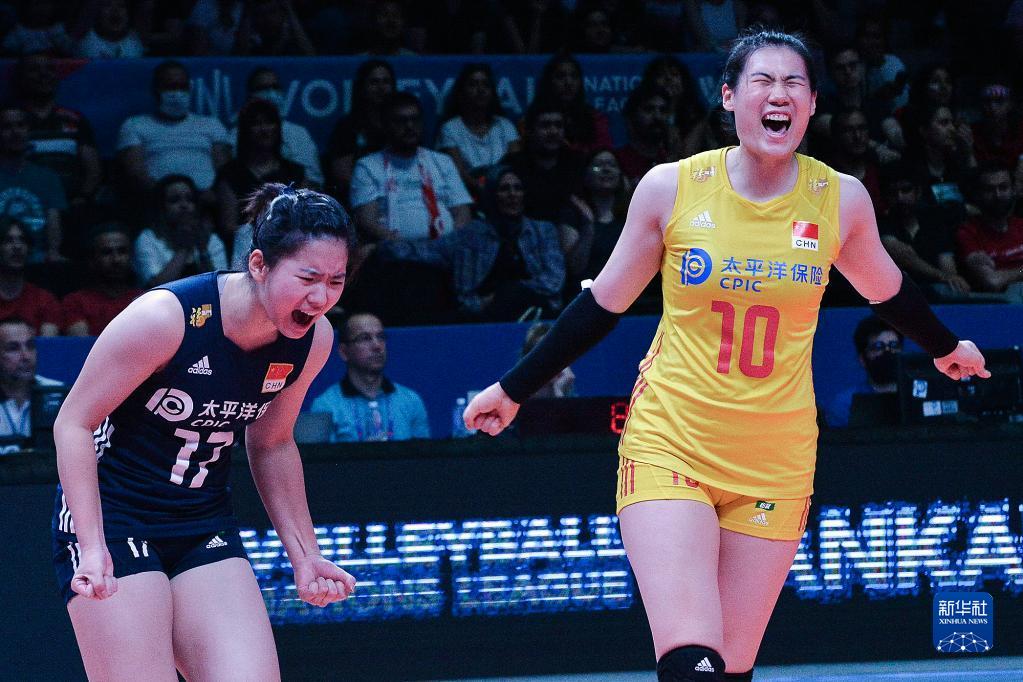 6月5日,中国队球员王云蕗(右)、倪非凡在比赛中庆祝得分。新华社发(穆斯塔法·卡亚摄)