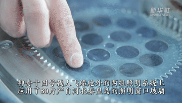神舟十四号载人飞船舱外的两组照明系统上,应用了80片产自河北省秦皇岛市的照明窗口玻璃,它们为航天员出舱活动及飞船的交会对接提供有力保障。