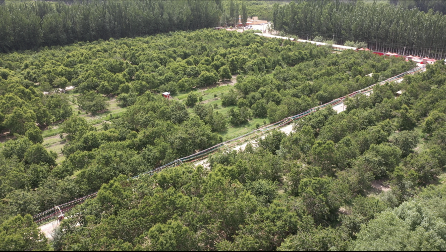 莎车县米夏镇夏玛勒巴格村樱桃农民专业合作社的樱桃园。(麦麦提艾力·麦麦提明 摄)(无人机照片)