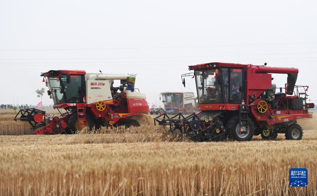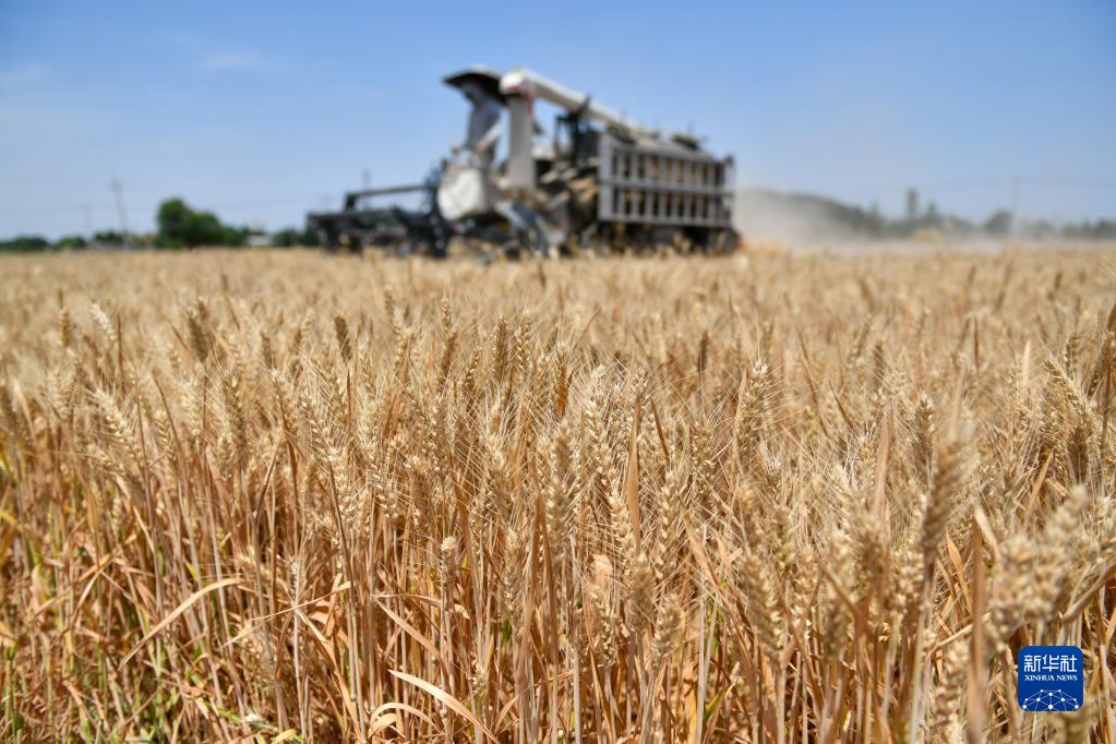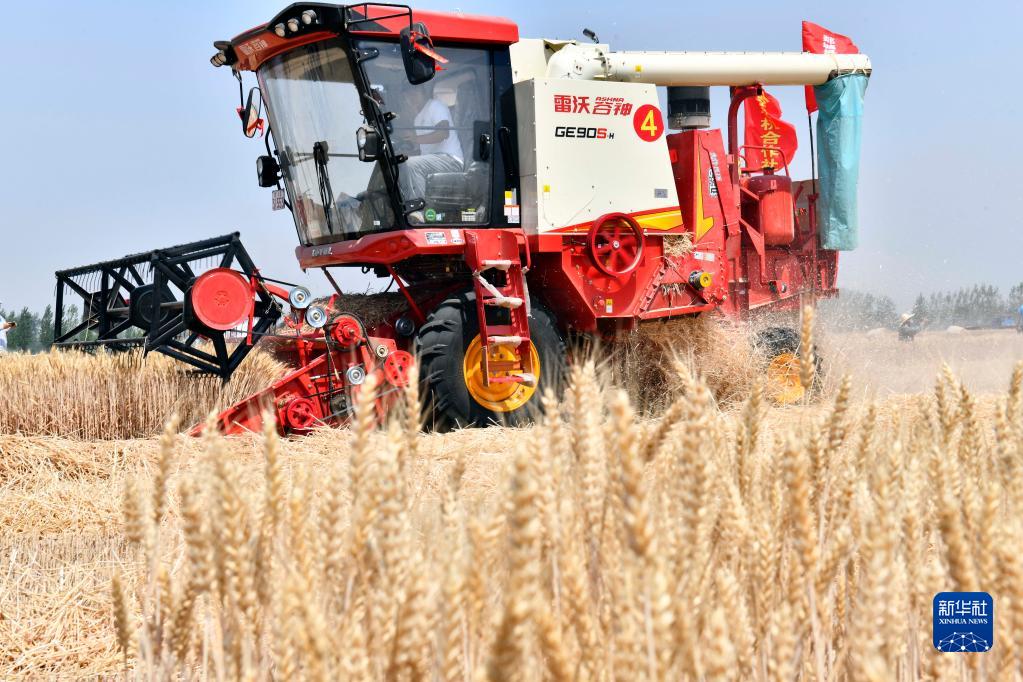 6月2日,在山东省郯城县郯城街道,农民驾驶农机收获小麦。新华社记者 郭绪雷 摄