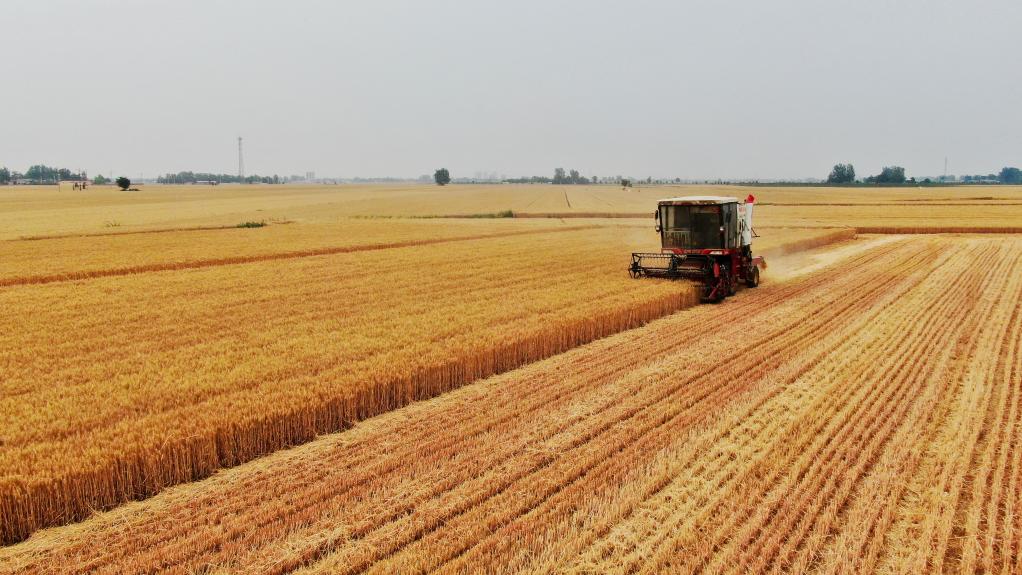 6月9日,在宁晋县换马店镇小康庄村,农机手驾驶联合收割机进行收割作业。(孙亚伟 摄)
