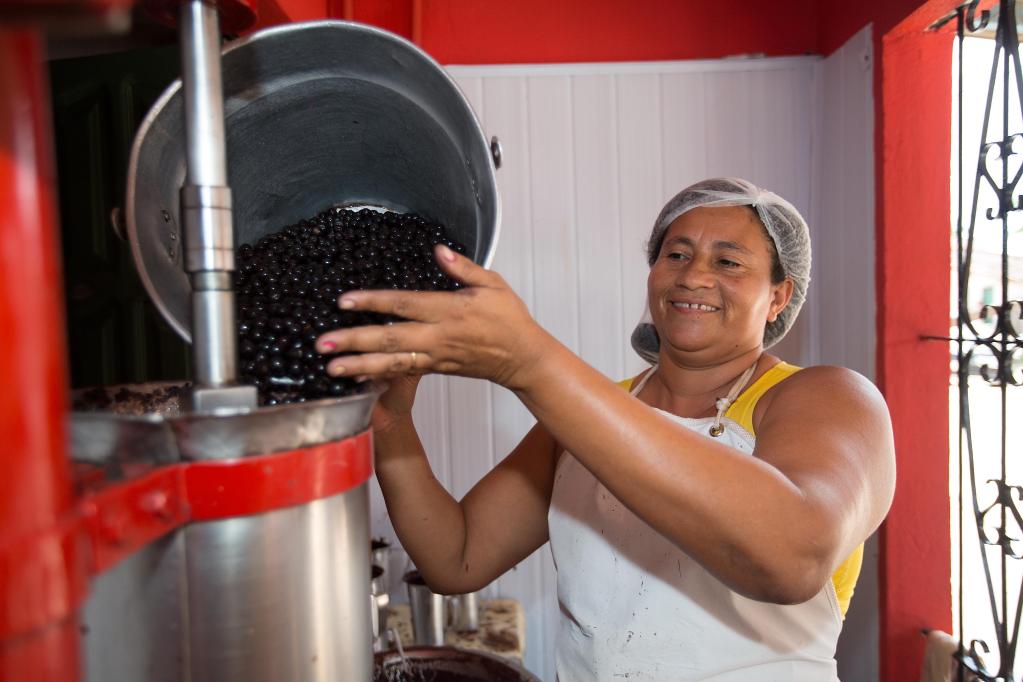 2017年7月15日,在巴西北部帕拉州维基亚市的“阿萨伊之家”小店,工作人员格洛丽亚将阿萨伊果倒入机器内打磨成果浆。新华社发(李明摄)