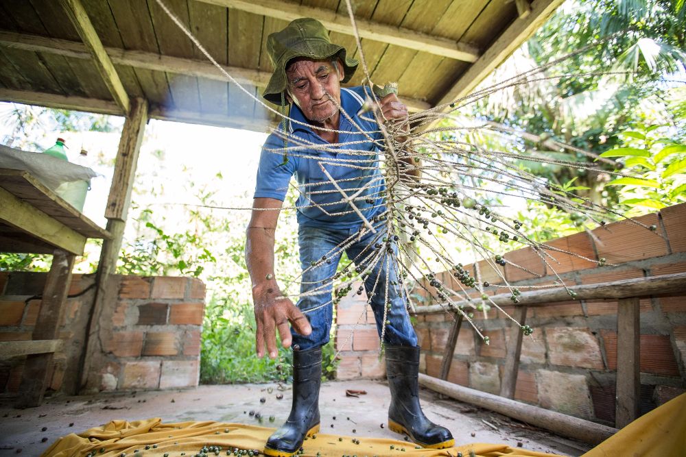 2017年7月15日,在巴西北部帕拉州维基亚市附近的圣若昂庄园,庄园主若昂·达席尔瓦将采摘的阿萨伊果从枝条上剥下。新华社发(李明摄)