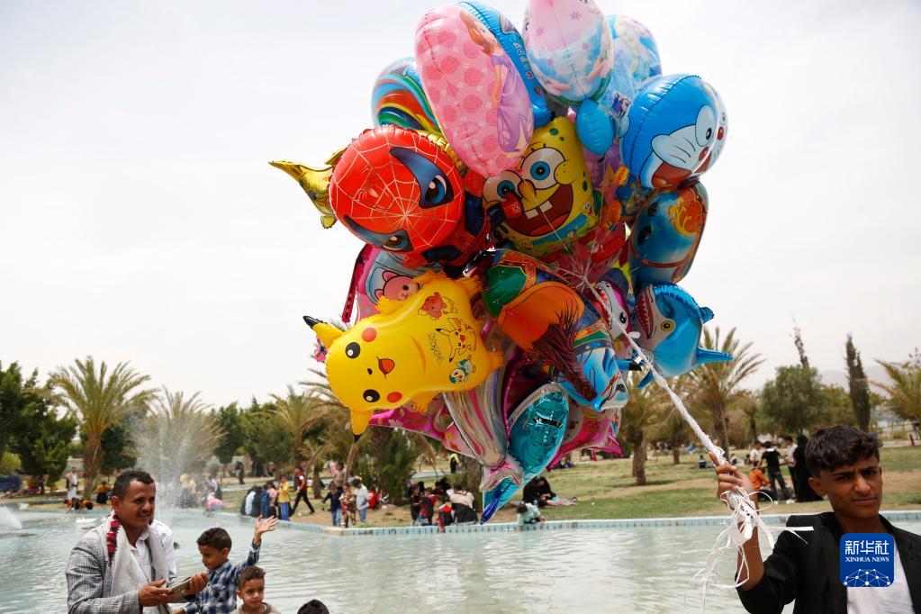 7月11日,小贩在也门萨那一处游乐园卖气球。西亚北非多国从7月9日开始宰牲节假期,然而持续的通货膨胀冲淡了节日氛围。人们无力举办传统庆祝仪式,商家销售惨淡,不少人直言这个宰牲节“不幸福”。新华社发(穆罕默德·穆罕默德摄)