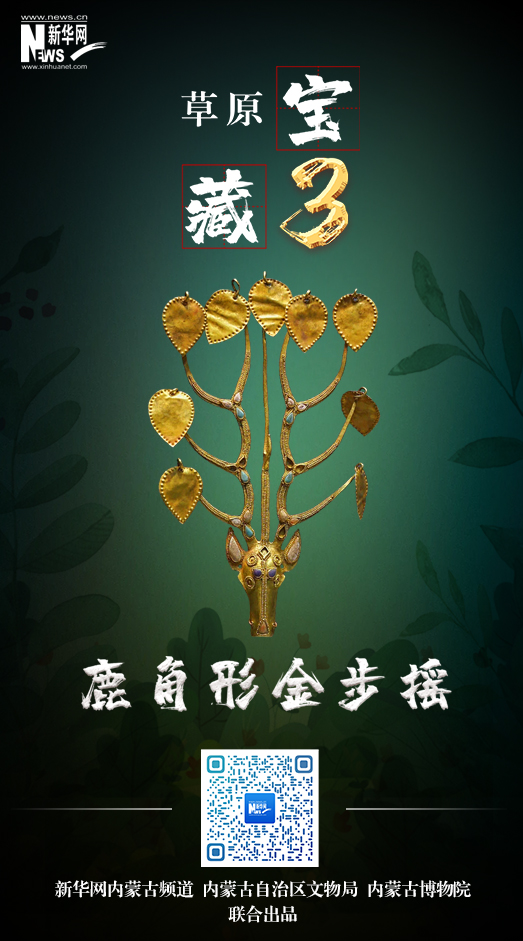 两件金步摇,一件类牛,一件似马。主体由黄金制作而成,造型像盘曲的连理扶桑。马头、牛头上生鹿角,金枝上再生可以自由摆动的叶片,似汉族步摇饰件上的垂珠,叶片会随着佩戴者的步伐有节奏地轻轻摇动,仿若点点花瓣纷飞。