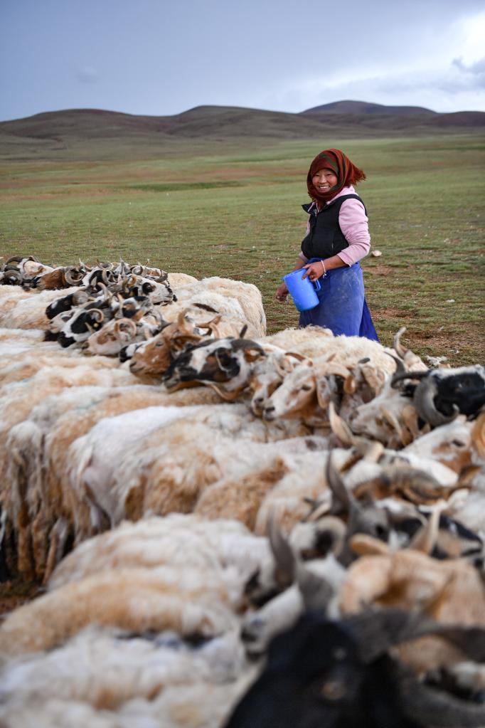 双湖县牧民在挤羊奶(7月12日摄)。新华社记者 晋美多吉 摄