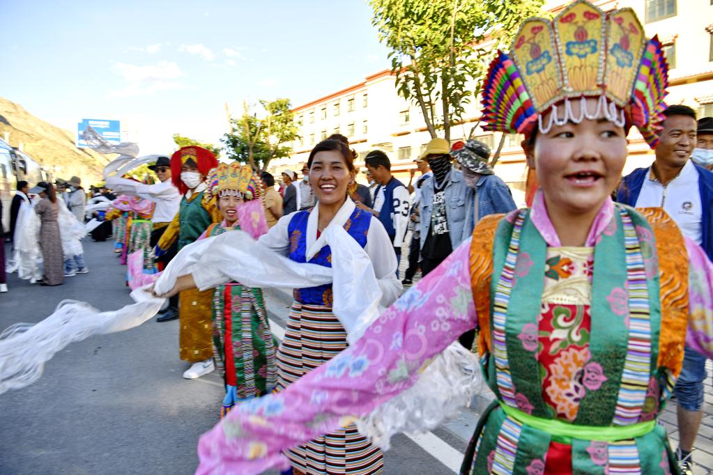 7月15日傍晚,贡嘎县的干部群众欢迎先期运送家具的双湖县搬迁群众。新华社记者 张汝锋 摄