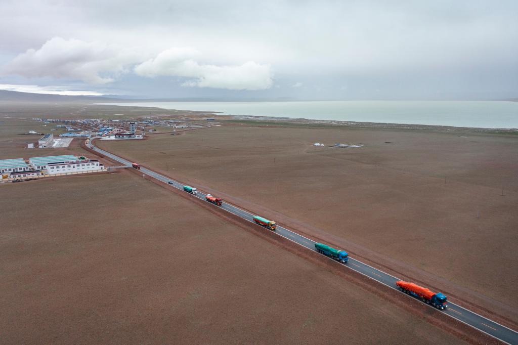 先期运送家具的货运车队从双湖县多玛乡出发(7月15日摄,无人机照片)。新华社记者 孙非 摄