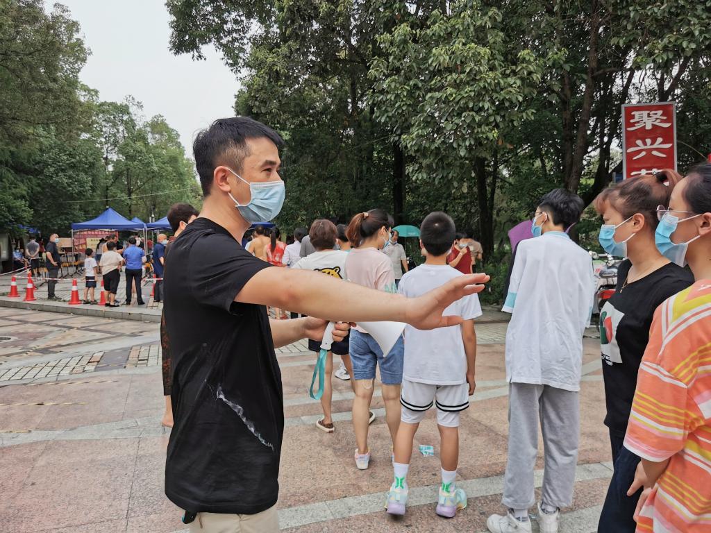 周亮在成都市武侯区簇桥街道龙井社区核酸检测点位维护现场秩序。(龙井社区供图)