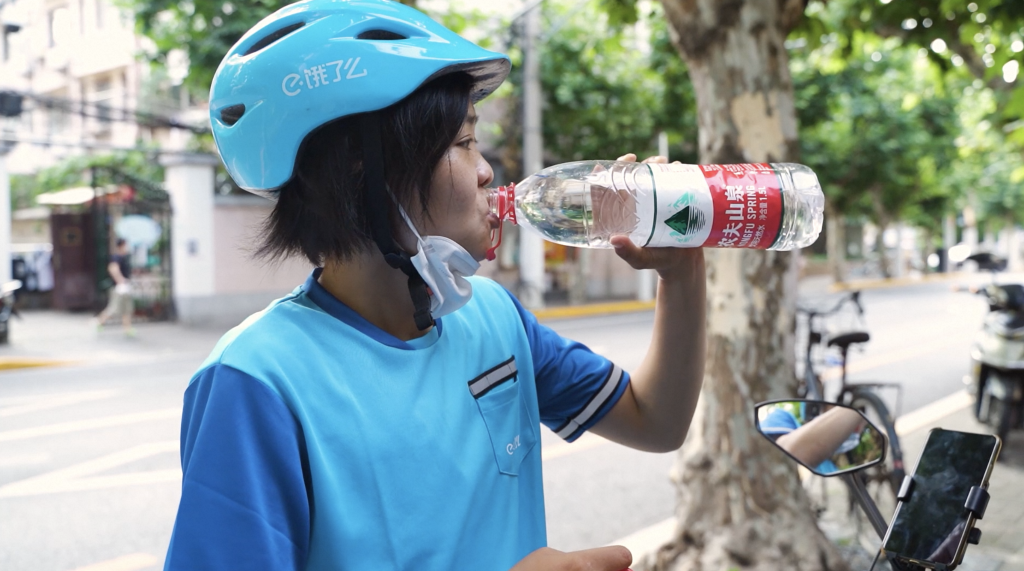“90后”骑手戴颖喝水防暑。(新华社发)