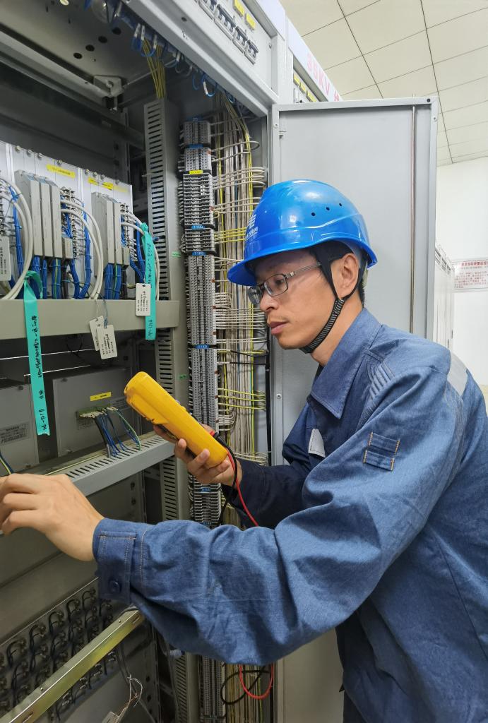 17日下午,贵阳市白云区220千伏鸡场变电站内,南方电网贵阳地区变电管理检修一班高级作业员李宏才和工友们在对断路器进行复检。