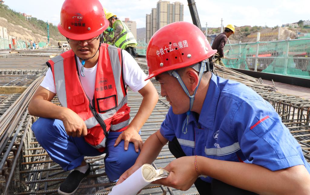 李鑫(右)与技术人员在施工现场讨论技术方案。(中铁十五局供图)