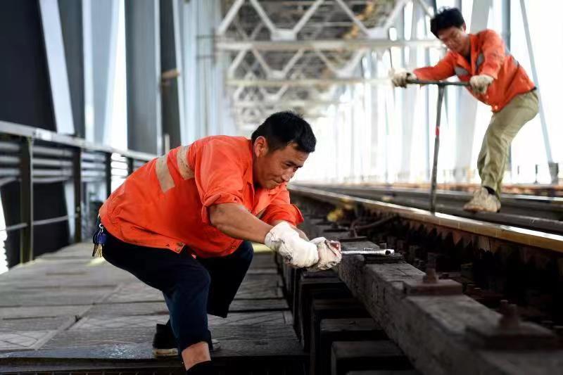 铁路桥隧工对九江长江大桥进行检修。(中国铁路南昌局集团公司供图)
