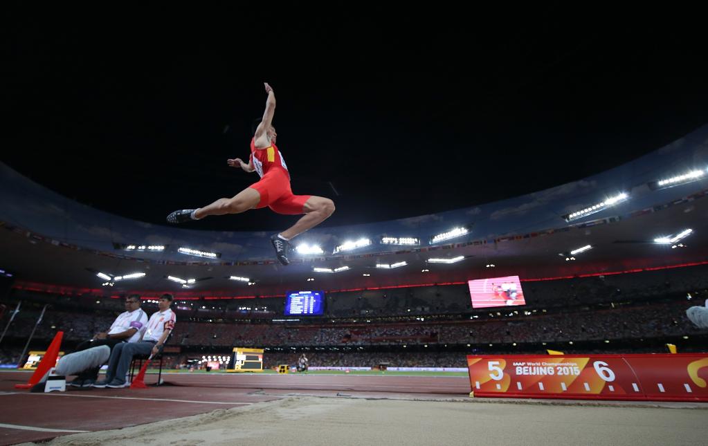 2015年8月25日,在2015年国际田联世界田径锦标赛男子跳远决赛中,王嘉男以8米18的成绩获得季军。新华社记者王丽莉摄
