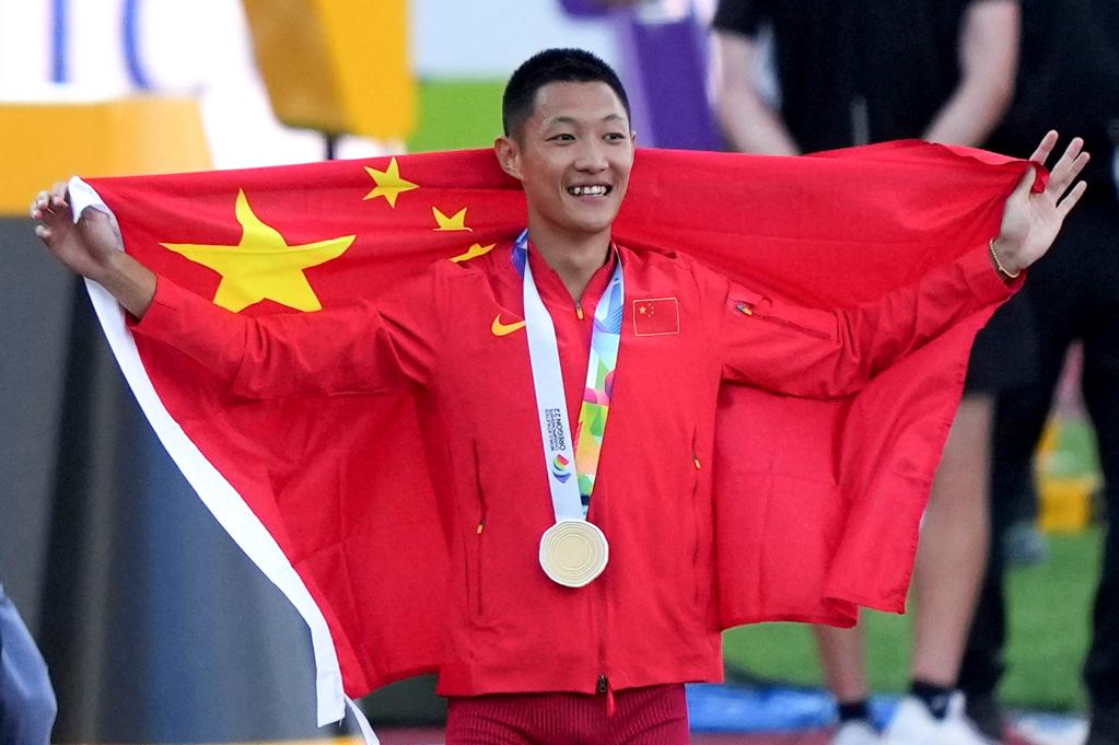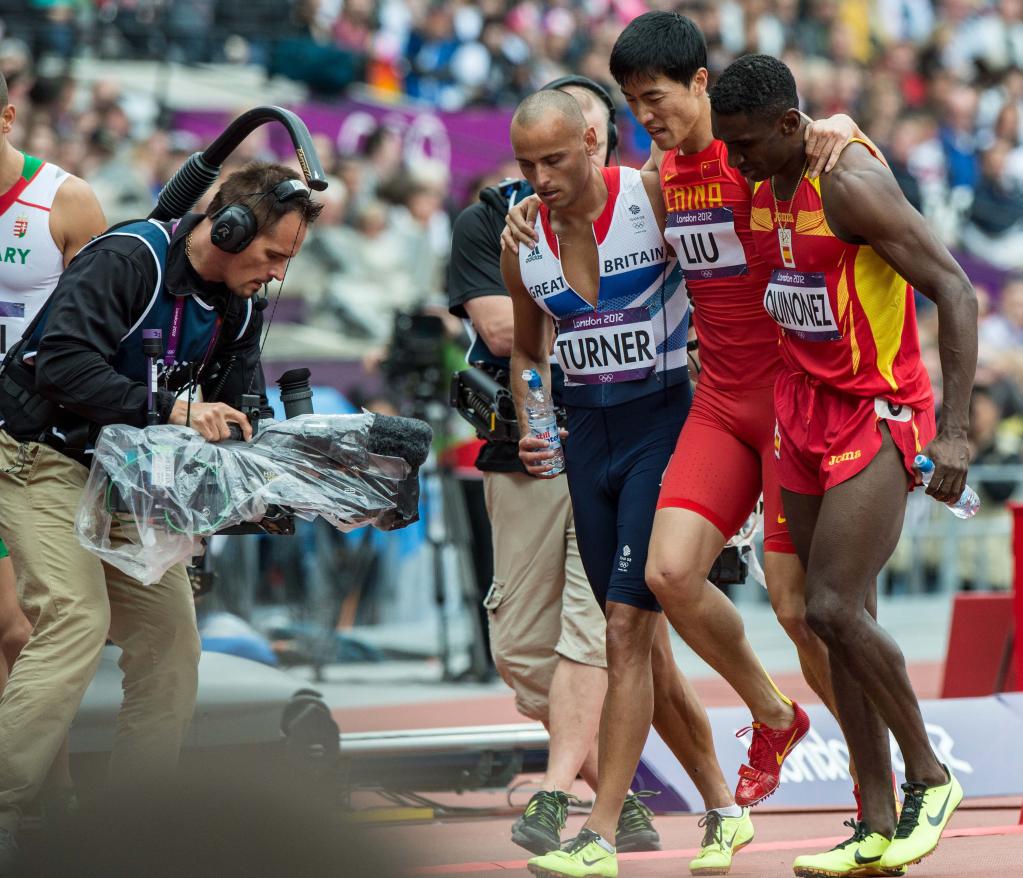 看着身披国旗的刘翔