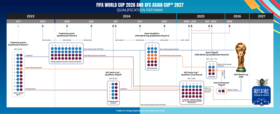 此外,亚足联表示,在2026年世界杯亚洲区预选赛和附加赛进行的同时,将举行2027年亚洲杯预选赛附加赛。在联合预选赛第一阶段被淘汰球队中的10支队伍将被抽出进行主客场对决(被淘汰球队中成绩最好的队伍不参赛),5支获胜球队晋级亚洲杯预选赛最终阶段。