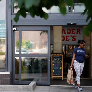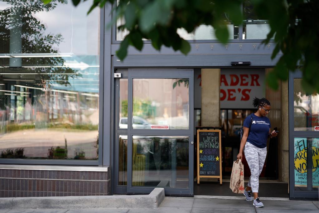 6月14日,在美国华盛顿,一名女子提着购物袋走出一家食品超市。(新华社发,沈霆摄)