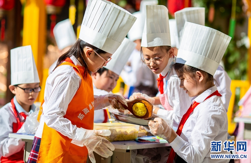 9月7日,呼和浩特市玉泉区恒昌店巷小学学生在学习做月饼。新华网 发(丁根厚 摄)