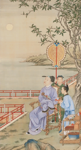 清代宫廷画家郎世宁绘有《雍正十二月行乐图》十二幅。其中“八月赏月”描述的是雍正帝在圆明园与众亲友一起赏月的场景。画面中,天上的大雁排成人字形南飞,寓意中秋时节,天气已转凉。一座三层的阁楼旁边,圆月在水中呈现倒影。阁楼前的露台上,雍正帝一行坐在案前赏月,其乐融融。《弘历观月图轴》则描绘了乾隆帝中秋赏月的场景。月夜里,湖塘边,老树下,乾隆帝凭栏而坐,欣赏着中秋满月。而他身后,两名小童或持扇而立,或端茶侍候,场面惬意舒畅。
