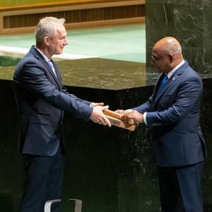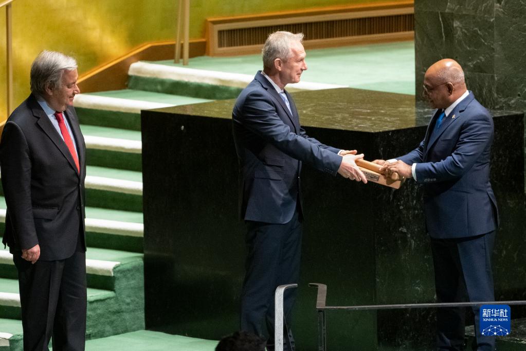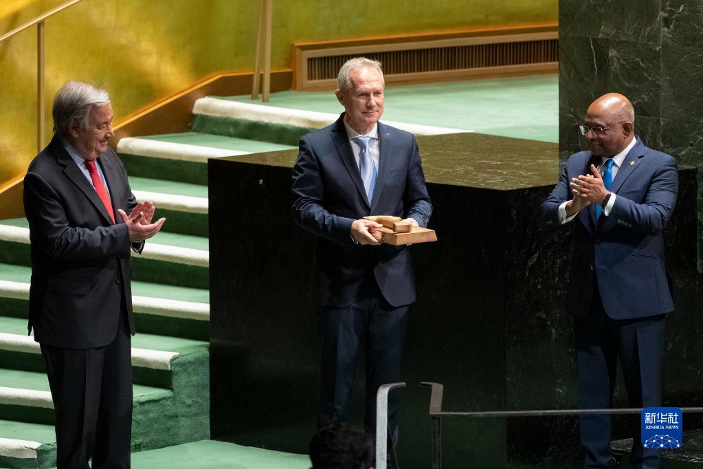 9月12日,在位于纽约的联合国总部,第77届联合国大会主席克勒希(中)从上届联大主席沙希德(右)手中接过象征联大主席权力的木槌。新华社发(联合国供图/埃万·施奈德摄)