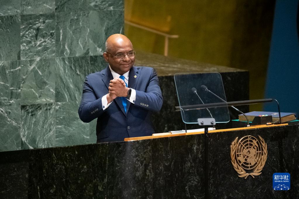 9月12日,在位于纽约的联合国总部,第76届联合国大会主席沙希德在第76届联合国大会闭幕会上发表讲话。新华社发(联合国供图/埃万·施奈德摄)